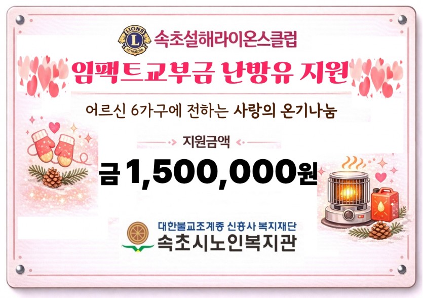 속초설해라이온스클럽 페이지 정보 작성자 속초설해 댓글 0건 조회 143회 작성일 26-02-11 19:59 본문 24-25LCIF 임팩트교부금 속초시 노인복지관 어르신6가구에 가구당 25만원씩 1,500,000원 난방비 지원했습니다 목록 이전글원주 백산클럽 재가노인 도시락 배달봉사 26.02.13 다음글원주 백산클럽 밥상공동체 종합사회복지관 배식봉사 26.02.10
