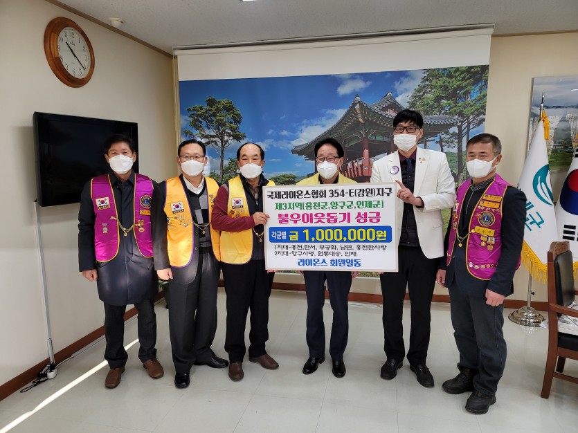 이현준 제3지역부총재는 “올해는 코로나19로 인해 봉사활동을 못하는 관계로 회원들이 평소 십시일반으로 마음을 모아 홍천, 인제, 양구 지역에 각각 100만원씩 성금기탁을 통해 이웃을 돕고자 하는 마음을 전하게 됐다”고 밝혔다.