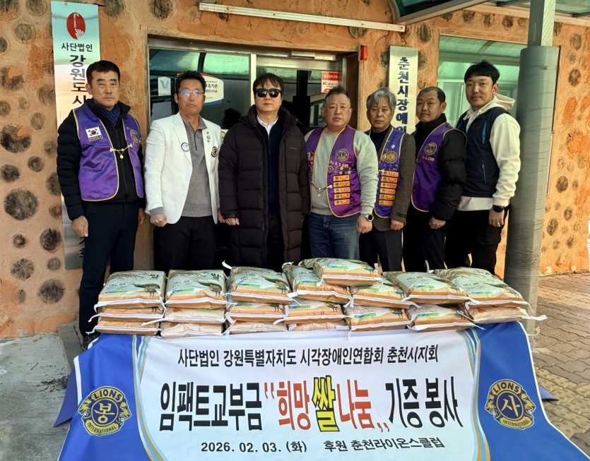 춘천라이온스클럽 회장 심헌용과 회원 일동은 명절을 맞아 임팩트교부금 사업의 일환으로 소외되고 취약한 시각장애인 가정에 도움이 될 수있는 봉사활동으로 사단법인 강원특별자치도 시각장애인연합회 춘천시지회에 10kg 쌀 50포를 전달 하였습니다. 이 쌀은 시각장애인연합회 춘천시지회에서 50가구를 선정해 배포할 예정 입니다.